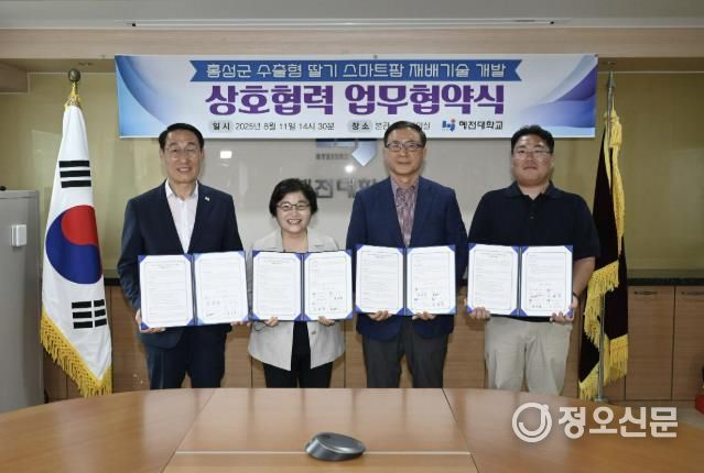 홍성군에 따르면 지난 11일 오후 2시30분 혜전대학교 본부 회의실에서, 수출 특화 스마트팜 딸기 재배기술 개발을 위해 홍성군, 혜전대학교, 연암대학교, 딸기육종 민간전문기업인 농업회사법인 헤테로(이하 헤테로)와 4자 공동 업무협약(MOU)을 체결했다고 밝혔다.