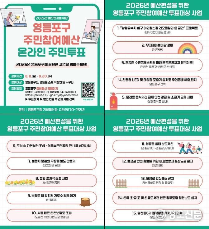 최호권 영등포구청장은 “이번 주민참여예산 투표는 주민의 의견이 구정에 직접 반영되는 소중한 기회”라며 “주민이 제안하고 선택한 사업이 실제 지역사회 변화로 이어질 수 있도록 최선을 다하겠다”라고 전했다.