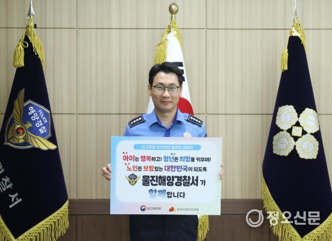 정오신문 관리자 기자 | 울진해양경찰서는 12일 ‘보건복지부와 함께하는 인구 문제 인식개선 릴레이 캠페인’에 참여했다고 밝혔다.