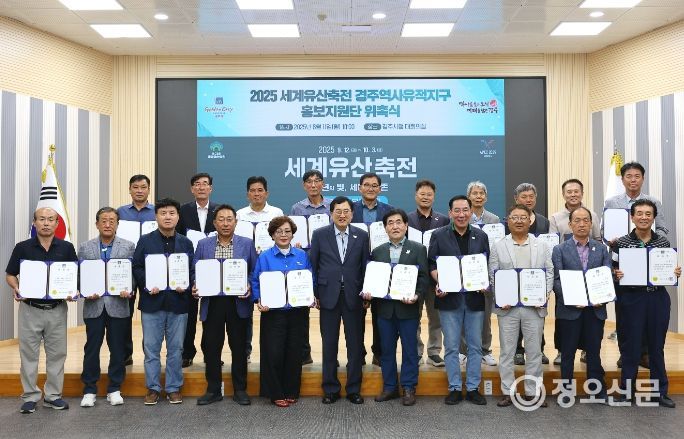 정오신문 관리자 기자 | 경주시는 11일 시청 대회의실에서 ‘2025 세계유산축전 경주역사유적지구 홍보지원단 위촉식’을 개최하고, 23개 읍면동 이‧통장협의회장을 중심으로 한 홍보지원단의 공식 출범을 알렸다.