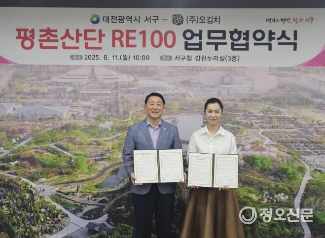 정오신문 관리자 기자 | 대전 서구는 지난 11일 관내 김치 전문 제조기업 ㈜오김치와 재생에너지의 보급 확산을 위한 RE100 업무협약을 체결했다.