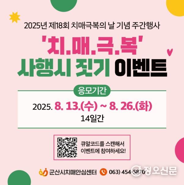 ‘치매 극복’ 사행시 행사는 군산시민 누구나 참여하고 응모할 수 있으며, 치매 인식개선을 위한 자유로운 주제를 담아 ‘치.매.극.복’ 사행시를 작성하면 된다. 응모 기간은 8월 13일~26일까지이다.