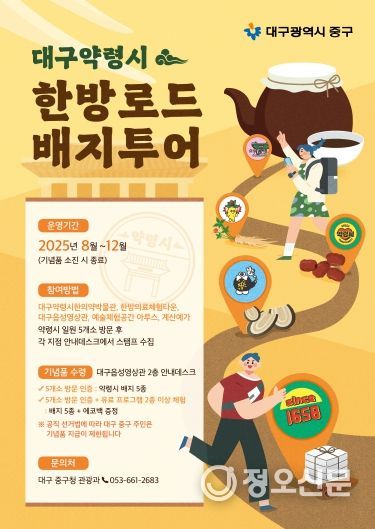 정오신문 관리자 기자 | 대구 중구는 대구약령시 관광 활성화를 위해 8월 14일부터 연말까지 ‘대구약령시 한방로드 배지투어’를 운영한다고 밝혔다.