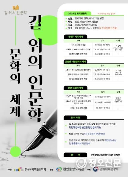 이번 프로그램은 ‘문학의 세계 – 인문학적 물음을 던지다’를 주제로, 시, 아동문학, 소설 각 장르별 대표 작가와 작품을 살펴보며 문학을 통해 삶과 사회를 성찰하는 시간을 가질 예정이다.