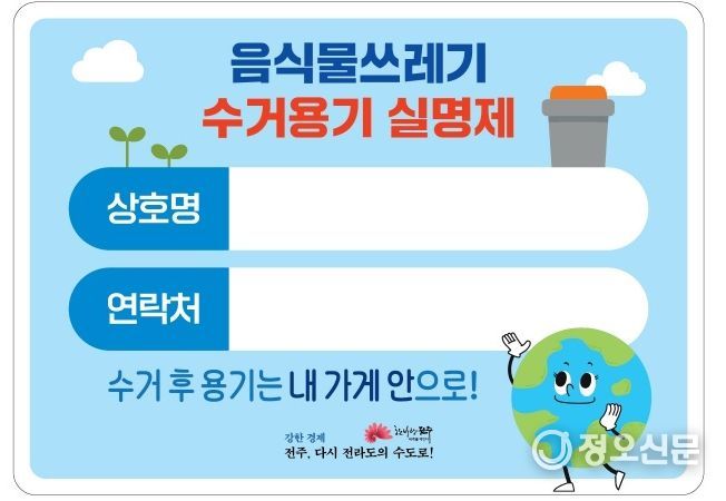 정오신문 관리자 기자 | 전주시가 주요 상권 지역의 도시미관을 해치고, 악취와 통행 불편 등 지속적인 민원이 제기되는 음식물쓰레기 문제를 해결하기 위해 수거용기 실명제를 본격 도입키로 했다.