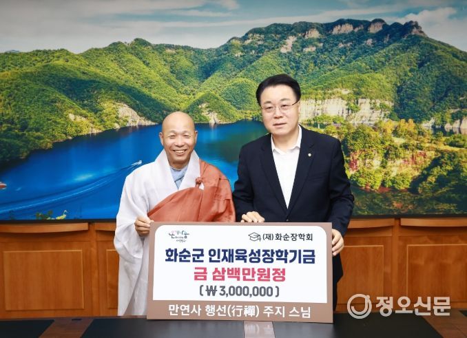정오신문 관리자 기자 | 화순군은 지난 11일 전통 사찰 만연사 행선 주지스님이 (재)화순장학회에 지역 인재 육성을 위한 장학금 300만 원을 기부했다고 밝혔다.