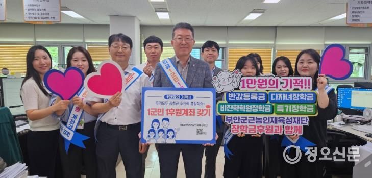 한편 근농인재육성재단은 연 2200여명의 학생들에게 약 20억원의 장학금 혜택을 지원하고 있으며 안정적인 재단 기금 확보를 위해 지난 7월부터 군민과 함께하는 ‘1만원의 기적, 장학금 1군민 1후원계좌 갖기’ 캠페인을 추진하고 있다.