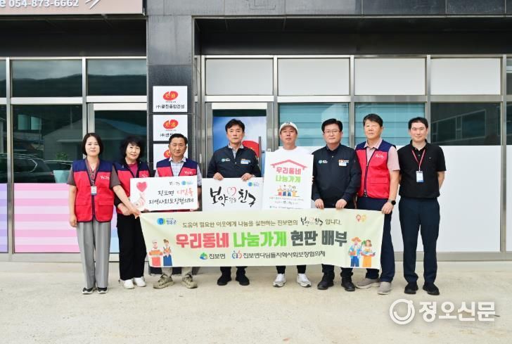 정오신문 관리자 기자 | 청송군 진보면사무소와 지역사회보장협의체는 12일, 지역 나눔활동에 꾸준히 참여해 온 ㈜광진개발을 ‘우리동네나눔가게’로 지정하고 현판을 전달했다.