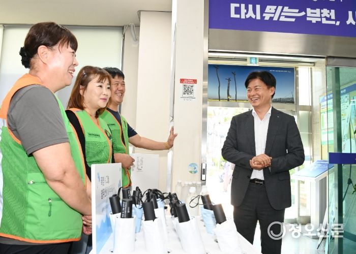 아울러 조용익 부천시장은 12일 원종사거리를 찾아 실외 무인 냉장고 ‘오아시수(水)’ 운영 현장을 점검했다. 이후 원종1동 행정복지센터를 방문해 양우산 비치 현황과 대여·반납 절차를 살피며, 폭염 속 시민 불편이 없도록 원활한 운영을 당부했다. 또한, 무더위에 외출한 시민에게 직접 양우산을 건네고, 폭염 시 건강관리 요령을 안내하는 등 시민들과 현장에서 소통하는 시간을 가졌다.