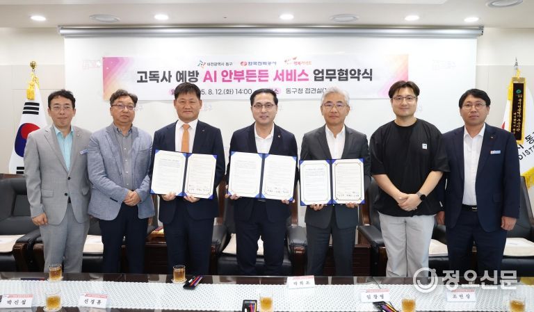 정오신문 관리자 기자 | 대전 동구는 12일 구청장 접견실에서 한국전력공사 대전세종충남본부(본부장 신경휴)‧행복커넥트(이사장 엄종환)와 고독사 예방을 위한 ‘AI 안부든든 서비스’ 업무협약을 체결했다고 밝혔다.