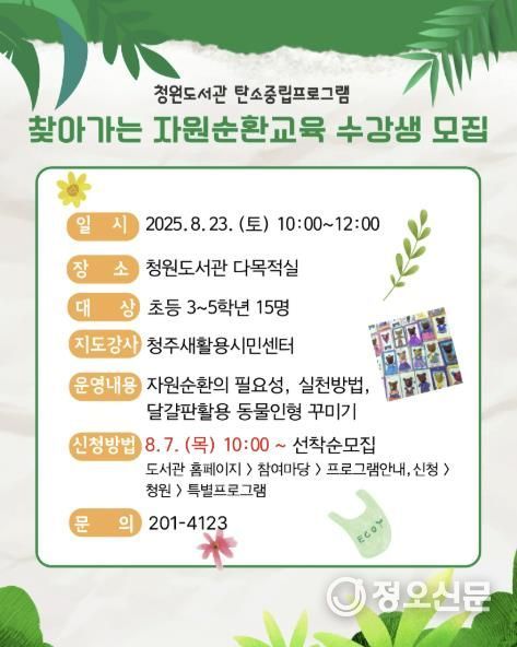 정오신문 관리자 기자 | 청주청원도서관은 탄소중립 실천과 인식 확산을 위해 오는 23일 오전 10시부터 낮 12시까지 도서관에서 초등 3~5학년을 대상으로 자원순환 교육 프로그램을 운영한다.