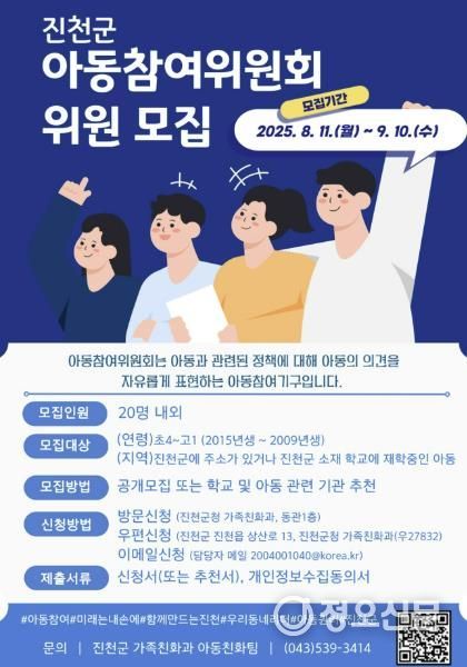 정오신문 관리자 기자 | 충북 진천군은 아동의 참여권 증진과 권익향상을 도모하기 위해 ‘제3기 아동 참여위원회 위원’을 신규 모집한다고 13일 밝혔다.