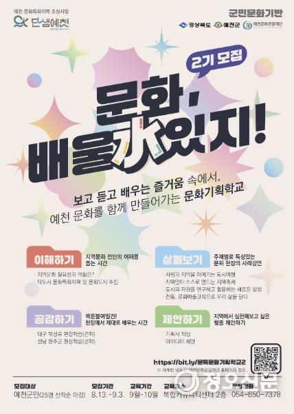 정오신문 관리자 기자 | 예천군과 (재)예천문화관광재단이 추진하는 ‘문화특화지역 조성사업’의 일환인 ‘문화기획학교 '문화 배울 수 있지'’ 2기 참여자를 이달 13일부터 9월 3일까지 모집한다.