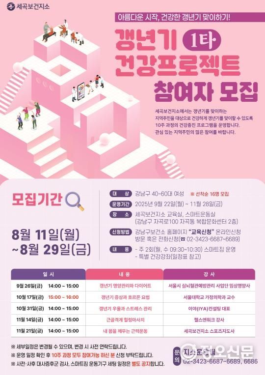 조성명 강남구청장은 “갱년기는 누구나 겪는 자연스러운 과정이지만, 건강관리에 따라 삶의 질이 달라진다”며 “맞춤형 건강 프로그램을 통해 갱년기를 보다 긍정적으로 받아들이고, 건강한 생활 습관을 만드는 계기가 되길 바란다”고 말했다.