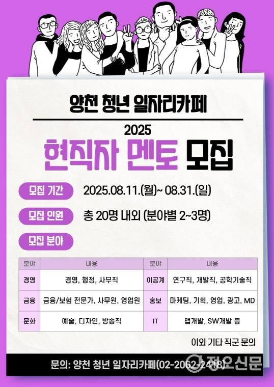 정오신문 관리자 기자 | 양천구는 청년 구직자에게 실질적인 취업 노하우를 전수할 '현직자 멘토'를 오는 31일까지 모집한다고 밝혔다.