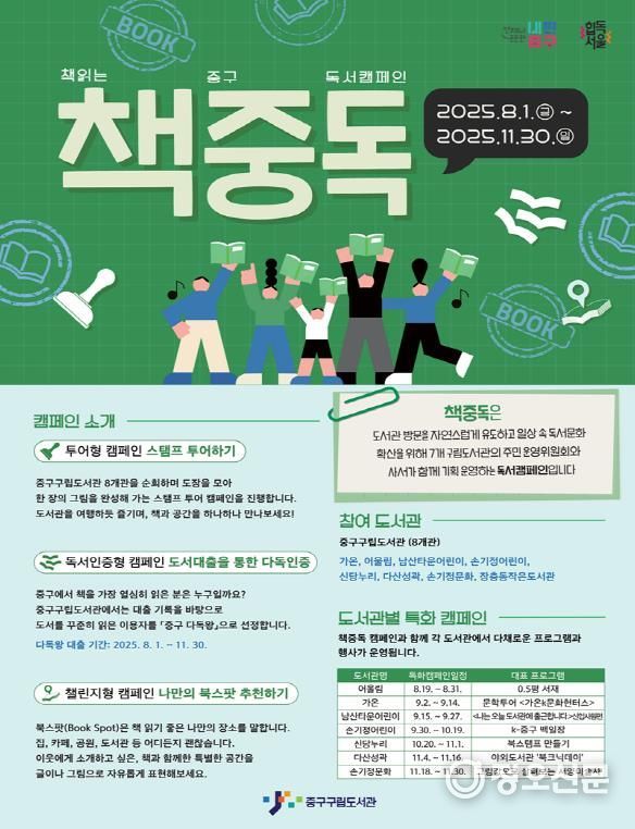 약 5개월간 준비 끝에 탄생한 ‘책·중·독’은 누구나 쉽게 참여할 수 있는 프로그램으로 구성됐다. 프로그램은 △도서관을 순회하며 도장을 모아 하나의 그림을 완성하는 ‘스탬프 투어’△대출 기록을 바탕으로 꾸준히 책을 읽은 주민을 선정하는 ‘중구 다독왕’△책과 공간을 주제로 이웃과 독서 경험을 공유하는 ‘나만의 북스팟 추천하기’등 다양하게 마련됐다. 모든 프로그램은 별도의 신청 없이, 도서관을 방문하면 누구나 자유롭게 참여할 수 있다.