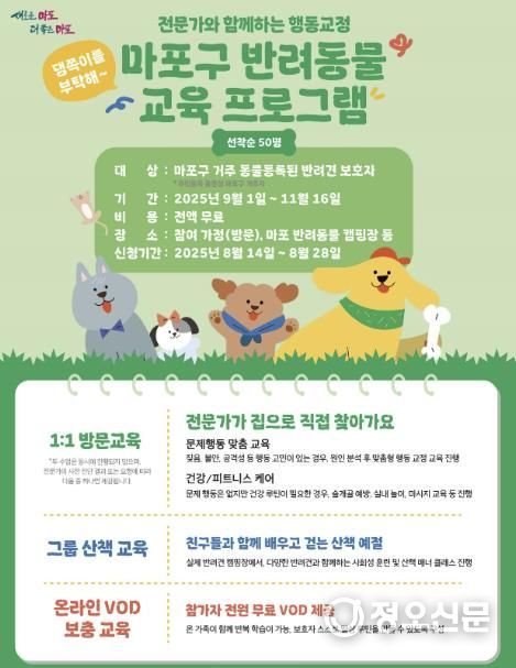 정오신문 관리자 기자 | 마포구는 반려인의 책임감 있는 양육 문화를 확산하고 유기동물 발생을 방지하기 위해 ‘2025년 반려동물 교육 프로그램’을 오는 9월 1일부터 11월 16일까지 운영한다.