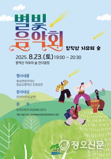 정오신문 관리자 기자 | 계룡시는 오는 23일 오후 7시부터 8시 30분까지 향적산 치유의 숲 잔디광장에서 ‘향적산 치유의 숲 별빛음악회’를 개최한다고 밝혔다.