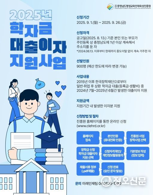 정오신문 관리자 기자 | 충청남도평생교육인재육성진흥원은 학자금 대출로 인해 발생된 대출이자에 대해 도민의 경제적 부담을 덜고자, 오는 9월 1일부터 9월 26일까지 진흥원 홈페이지를 통해 ‘2025년 학자금 대출이자 지원사업' 신청 대상자를 모집한다.
