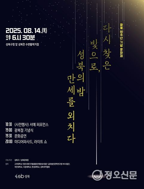 정오신문 관리자 기자 | 서울 성북구가 오는 14일 성북구청 앞 수변활력거점 일대에서 광복 80주년 기념 문화제 ‘다시 찾은 빛으로, 성북의 밤 만세를 외치다’를 개최한다.