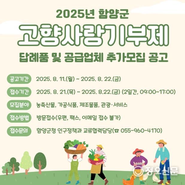군 관계자는 “이번 답례품 공급업체 추가 모집은 함양군만의 특색과 품질을 담은 새로운 답례품을 발굴해 기부자분들께 더 폭넓은 선택권을 드리기 위한 것”이라며, “지역의 우수한 업체들이 적극적으로 참여해 주셔서, 고향사랑기부제가 지역경제 활성화와 판로 확대, 매출 증대까지 이어질 수 있도록 함께해 주시길 바란다”라고 말했다.