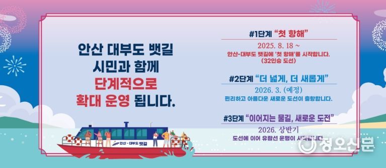 시는 ▲1단계 ‘안산호’ 첫 항해를 시작으로 ▲내년도 2단계 신규 도선 출항 ▲3단계 유람선 운행 등 단계적 확대 운영 계획을 추진한다. 운영 과정에서 시민 의견을 적극 반영해 노선과 서비스 품질을 지속 개선하는 한편, 똑버스 및 시티투어버스, 관광 해설사 등을 활용해 대부도와의 관광 연계성을 확보해 나갈 계획이다. 이를 통해 안산시는 지역 해양관광 활성화와 관광지 접근성 향상이라는 두 마리 토끼를 잡는다는 목표다.