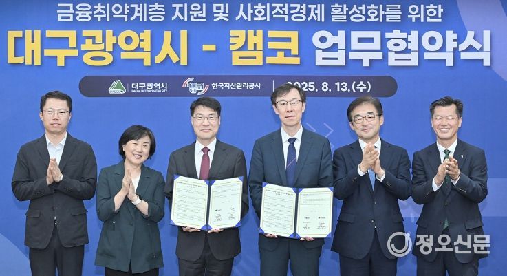 정오신문 관리자 기자 | 대구광역시는 8월 13일 오전 10시 30분, 동인청사 2층 상황실에서 한국자산관리공사(이하 ‘캠코’)와 함께 금융취약계층 지원 및 사회적경제 활성화를 위한 업무협약을 체결했다.