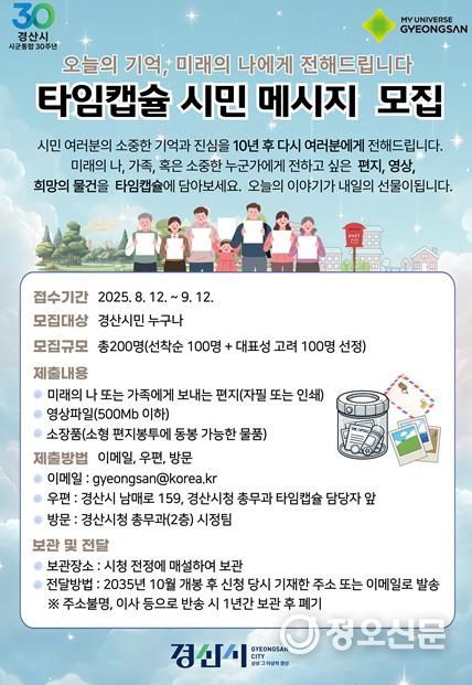 정오신문 관리자 기자 | 경산시는 시군통합 30주년을 맞아 시민들의 소중한 기억과 희망을 담은 ‘타임캡슐 메시지’를 8월 12일부터 9월 12일까지 접수한다고 밝혔다.