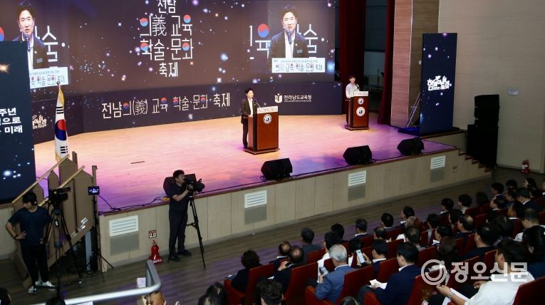 개막식 식전 공연은 큰 감동을 안겼다. 순천 615통일합창단이 무대에 올라 ‘거국행’부터 ‘광복군가’까지 연대별 항일음악 330곡 중 엄선한 5곡을 들려줬다. 피날레는‘통일행진곡’으로 객석의 교육가족들 모두 태극기를 흔들며 함께해 의미를 더했다. 이 노래는 향후 음원 파일로 제작해 학교현장에 보급될 예정이다.