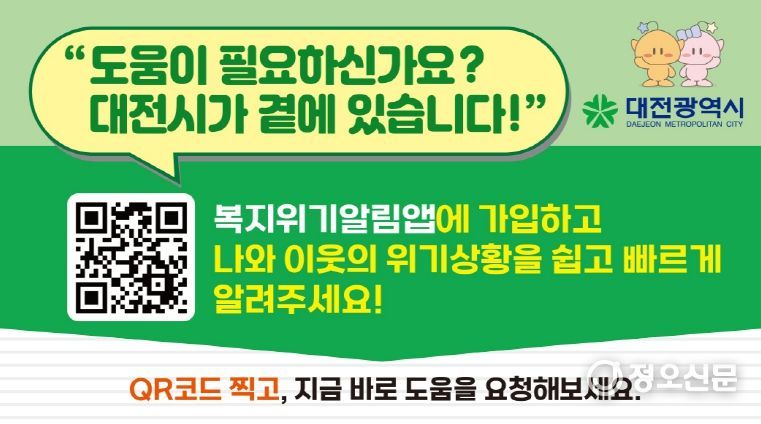 앞면에는 “도움이 필요하신가요? 대전시가 곁에 있습니다!”라는 문구와 함께 복지위기 알림서비스 QR코드를 포함했다.