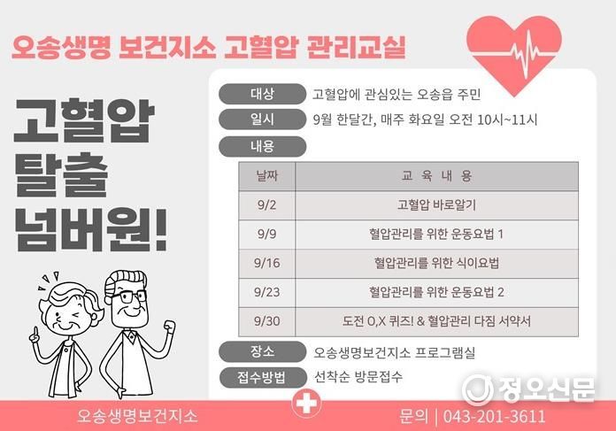 고혈압 관리 교실은 오송생명보건지소는 9월 2일부터 9월 30일까지 매주 화요일, 강내보건지소는 9월 4일부터 10월 2일까지 매주 목요일 오전 10시부터 11시까지 5주간 진행된다.