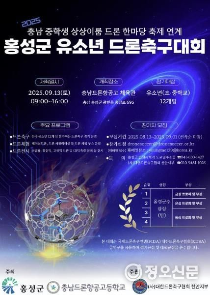정오신문 관리자 기자 | 홍성군은 내달 13일에 ‘2025년 홍성군 유소년 드론축구대회’를 광천읍 충남드론항공고등학교 체육관에서 개최한다고 밝혔다.
