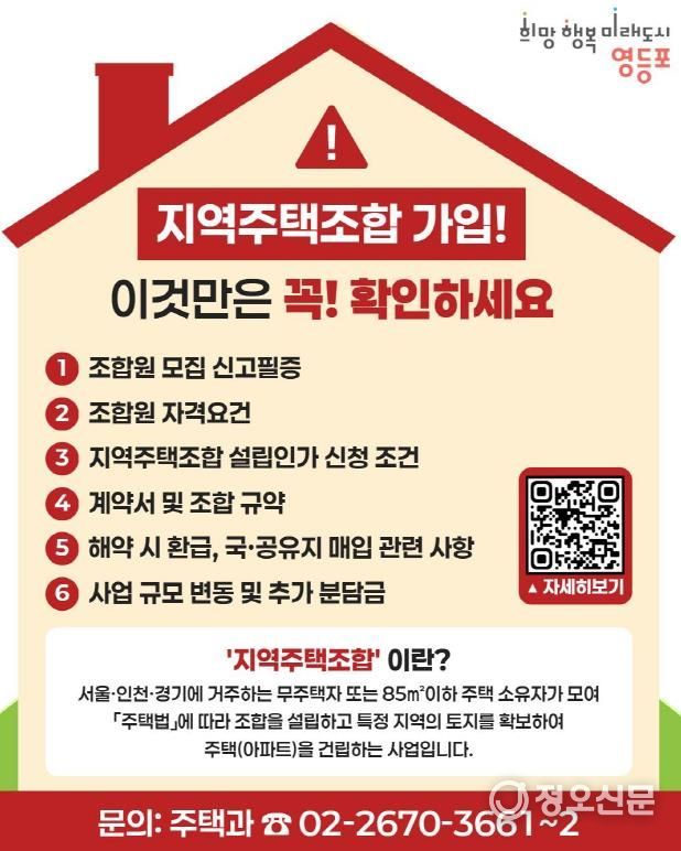 특히 구는 지역주택조합 피해 예방을 위한 적극적인 홍보도 추진하고 있다. 조합 가입 안내 리플릿을 동 주민센터 등에 비치하고, 세부 내용을 확인할 수 있는 카드뉴스를 누리 소통망(SNS)에 게시해 주민에게 경각심을 높일 예정이다. 아울러 영등포구 누리집(홈페이지)에서 ‘지역주택조합’을 검색하면 사업 현황, 절차, 피해 사례 등을 한눈에 확인할 수 있다.