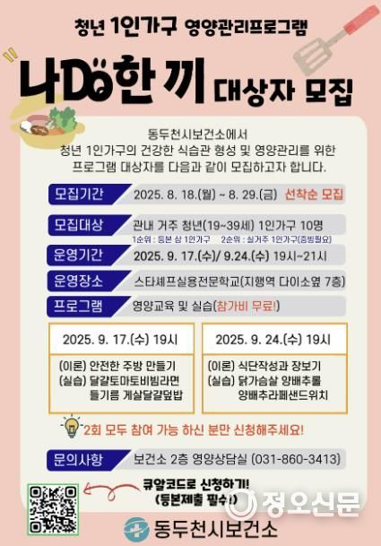 정오신문 관리자 기자 | 동두천시 보건소는 청년 1인 가구를 위한 맞춤형 영양관리 프로그램 ‘나DO한끼’ 참여자를 오는 8월 18일부터 29일까지 선착순 10명 모집한다고 밝혔다.