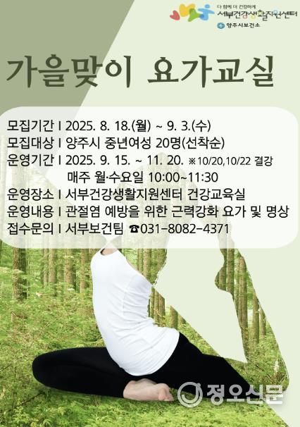 정오신문 관리자 기자 | 양주시보건소 서부건강생활지원센터에서 건강생활 실천율 향상과 지역 주민의 신체활동 증진을 위해 중년여성을 대상으로 '가을맞이 요가교실' 참여 대상자를 모집한다.