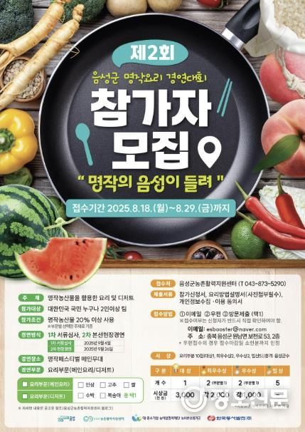 경연은 음성명작 농산물(인삼, 고추, 쌀, 수박, 복숭아 중 택1)이 20% 이상 사용돼야 하며 메인요리와 디저트를 심사하는 ‘요리부문’과 명작농산물을 활용한 전시작품을 출품하는 ‘전시부문’으로 나눠 진행된다.