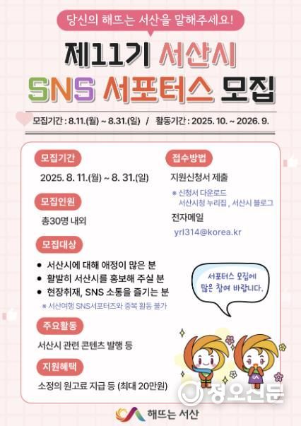 시는 제11기 서산시 SNS 서포터스로 30명 내외를 모집할 예정이다.