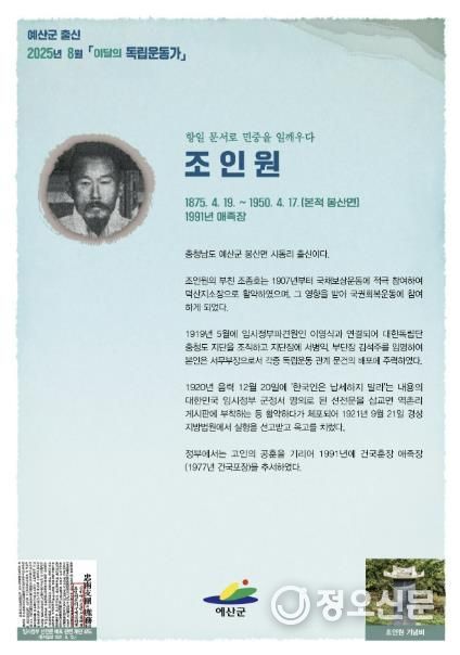 정오신문 관리자 기자 | 예산군은 봉산면 시동리 출신 조인원 독립운동가를 ‘2025년 8월 이달의 독립운동가’로 선정했다고 밝혔다.