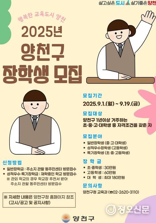 정오신문 관리자 기자 | 양천구는 지역 학생들의 균등한 교육 기회 보장과 학업능력 향상을 위해 ‘2025년 양천구 장학생’ 170명을 선발, 총 1억 5천만 원 규모의 장학금을 지급한다고 18일 밝혔다.