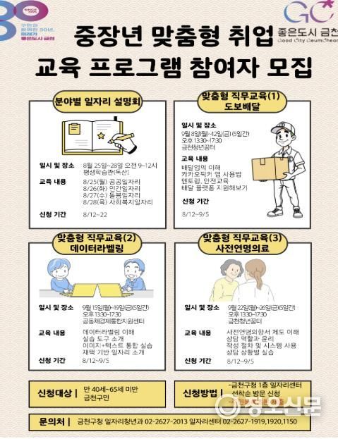 정오신문 관리자 기자 | 금천구는 오는 8월 25일부터 9월 26일까지 금천구 중장년층을 대상으로 분야별 일자리 설명회와 맞춤형 직무 교육을 운영한다고 밝혔다.