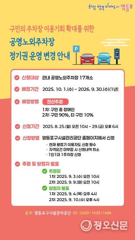 신청은 ‘영등포구시설관리공단’ 누리집(홈페이지)에서 가능하며, 대상 주차장 17개소 현황도 함께 확인할 수 있다. 자세한 사항은 구청 주차문화과 또는 영등포구시설관리공단으로 문의하면 된다.