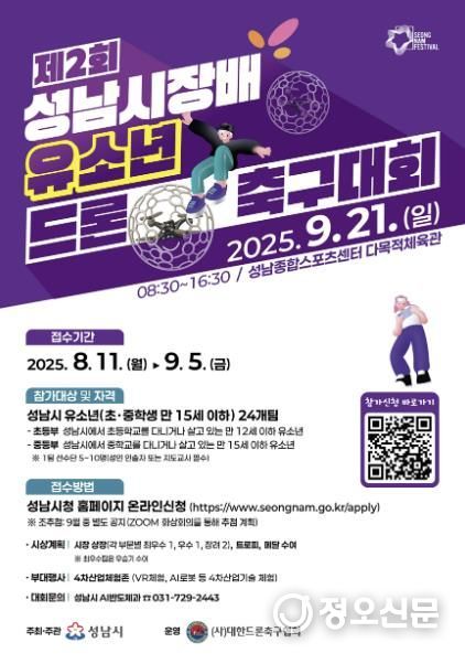 정오신문 관리자 기자 | 성남시는 오는 9월 21일 성남종합스포츠센터 다목적체육관에서 열리는 ‘제2회 성남시장배 유소년 드론 축구대회’ 참가팀을 9월 5일까지 모집한다.