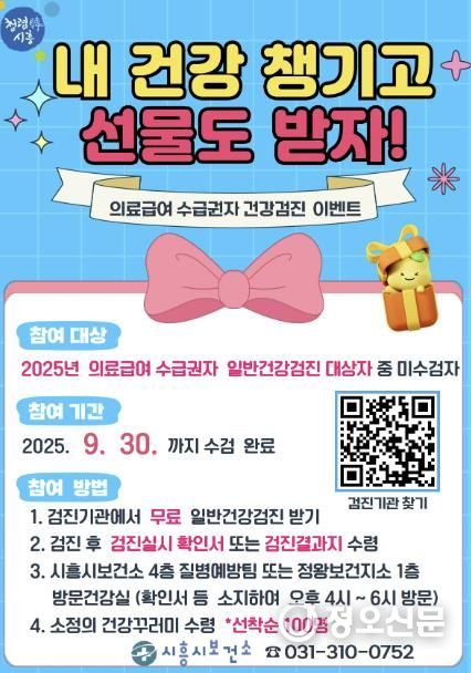 이형정 시흥시보건소장은 “일반건강검진은 건강을 지키는 가장 기본적인 수단”이라며 “이번 이벤트를 통해 많은 대상자가 검진에 참여해 건강한 일상을 누리기를 바란다”라고 전했다.
