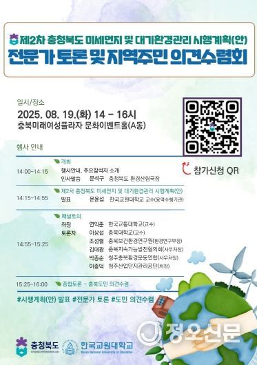 정오신문 관리자 기자 | 충북도는 오는 19일 오후 2시 충북미래여성플라자 문화이벤트홀에서 ‘제2차 충청북도 미세먼지 및 대기환경관리 시행계획’에 대해 도민과 전문가 의견을 수렴하는 자리를 마련한다.