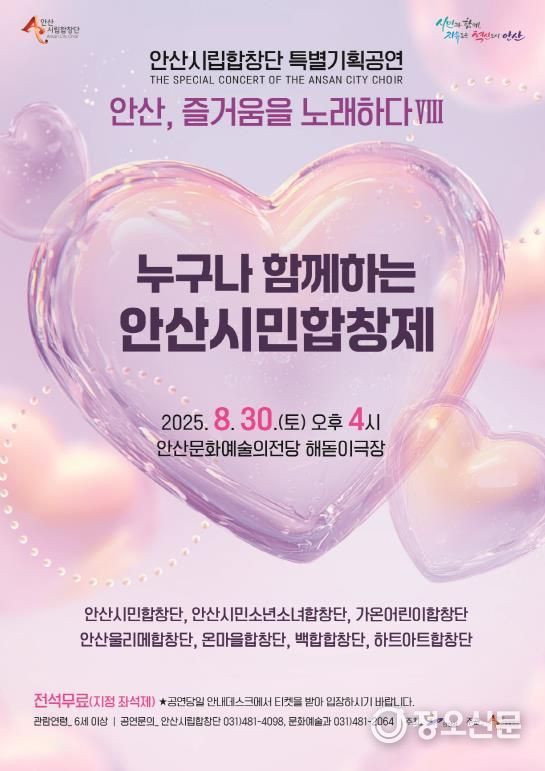 정오신문 관리자 기자 | 안산시는 오는 30일 안산문화예술의전당 해돋이극장에서 안산시립합창단 기획공연 ‘안산, 즐거움을 노래하다 Ⅷ - 누구나 함께하는 안산시민합창제’를 개최한다고 18일 밝혔다.