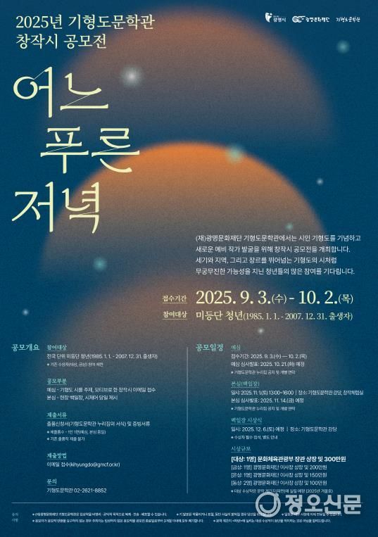 정오신문 관리자 기자 | (재)광명문화재단 기형도문학관이 새로운 모습의 창작시 공모전 ‘어느 푸른 저녁’(이하 공모전)에 참여할 미등단 청년을 9월 3일부터 10월 2일까지 30일간 모집한다.