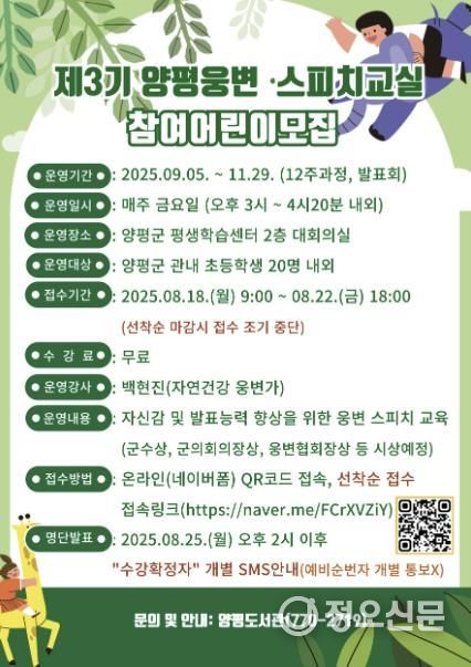 정오신문 박 헌 기자 | 양평군은 관내 초등학생을 대상으로 상반기에 운영된 제2기 ‘양평 웅변·스피치 교실’에 이어, 하반기에는 ‘제3기 양평 웅변·스피치 교실’을 운영한다고 밝혔다.