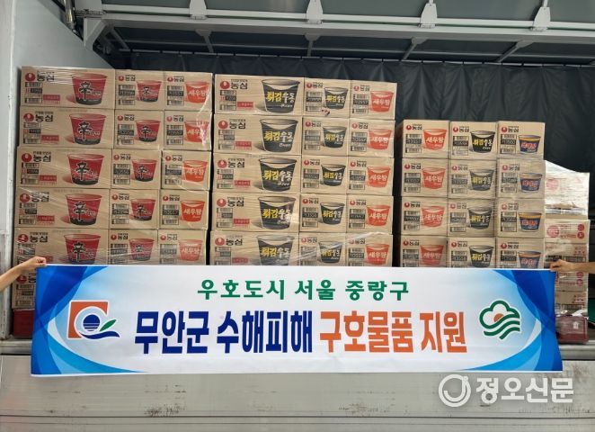 정오신문 관리자 기자 | 전남 무안군이 13일 우호도시 서울 중랑구로부터 최근 기록적인 폭우로 피해를 본 군민들을 돕기 위해 긴급 구호물품을 지원받았다.