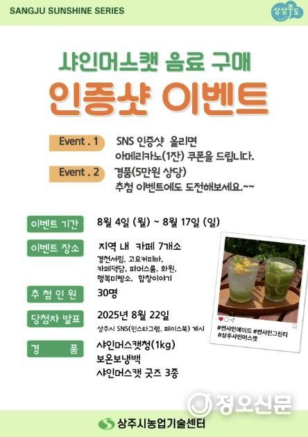 정오신문 관리자 기자 | 상주시농업기술센터는 샤인머스캣 시그니처 음료 소비확대 및 지역 농산물 홍보를 위해 8월 4일부터 8월 17일까지 SNS 인증샷 이벤트를 진행한다.