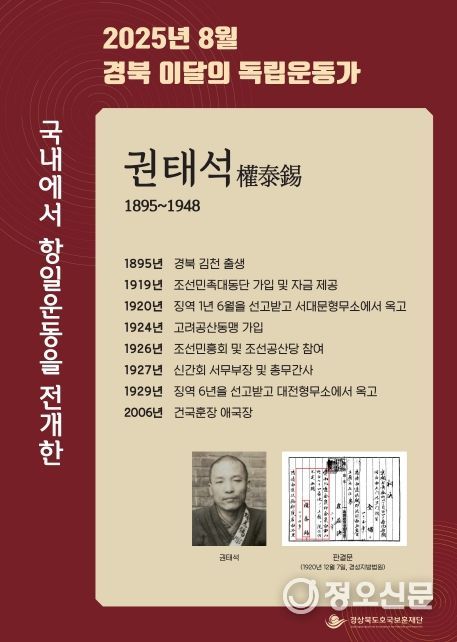 정오신문 관리자 기자 | (재)경상북도호국보훈재단은 8월의 독립운동가로 조선민족대동단에서 활동한 권태석 선생을 선정했다.